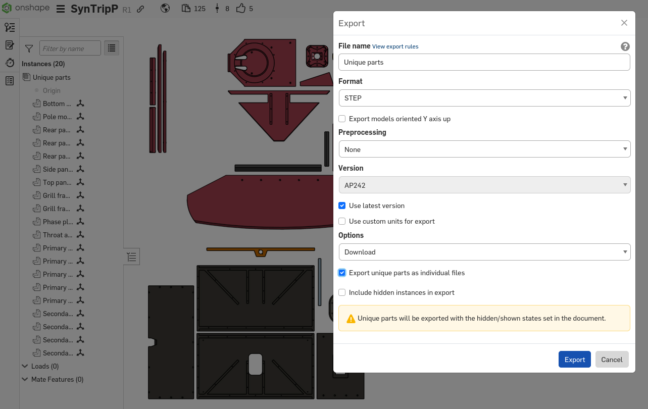 So I logged in to onshape, downloaded the step files individually and opened them in FreeCAD.