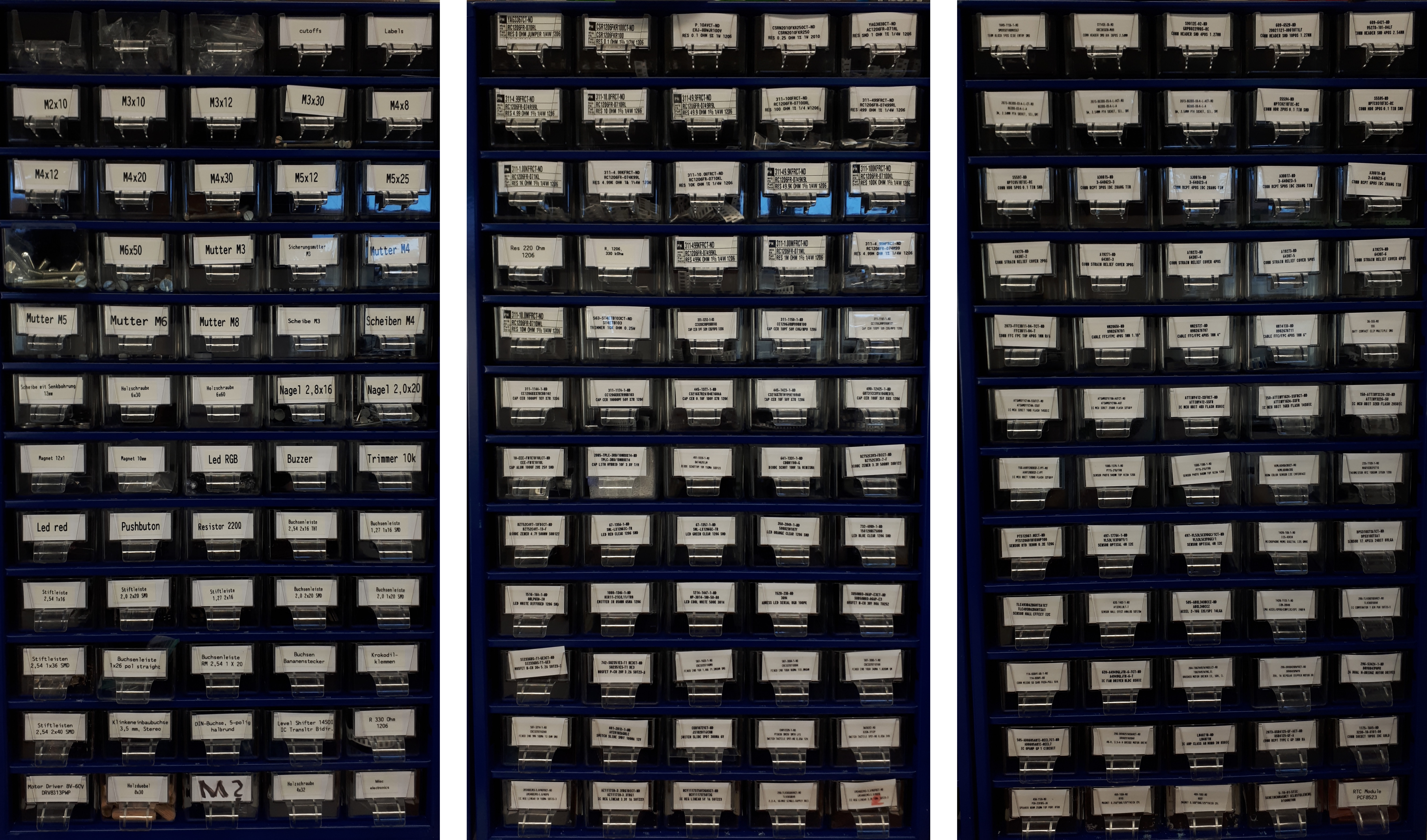 The parts available at our Fab Lab overlap with the ones listed at the Fab Academy inventory. However, not every part listed at the inventory is available at the Fab Lab. Therefore, I needed to check the drawers at the lab. Below you can see a picture for reference. Note that this is only a snapshot taken in January 2026. The set of available parts at the lab might have changed since then.