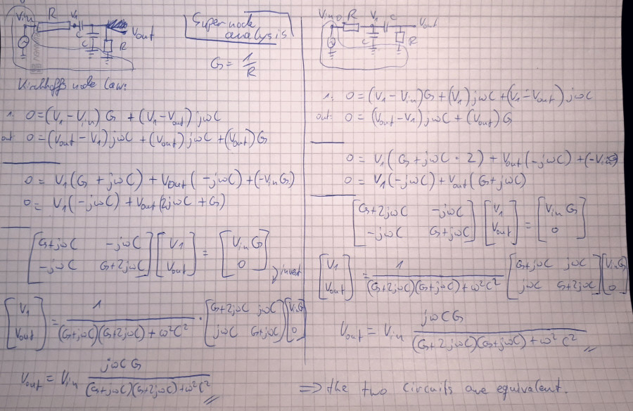 A side note: when I think of implementing a band pass, I naively think about concatenating a low pass and a high pass. However, the given filter circuit looks somehow different. Still, the two circuits (concatenated low and high pass and the one given in the video) are equivalent with respect to the in- and output voltage, as shown in this calculation.