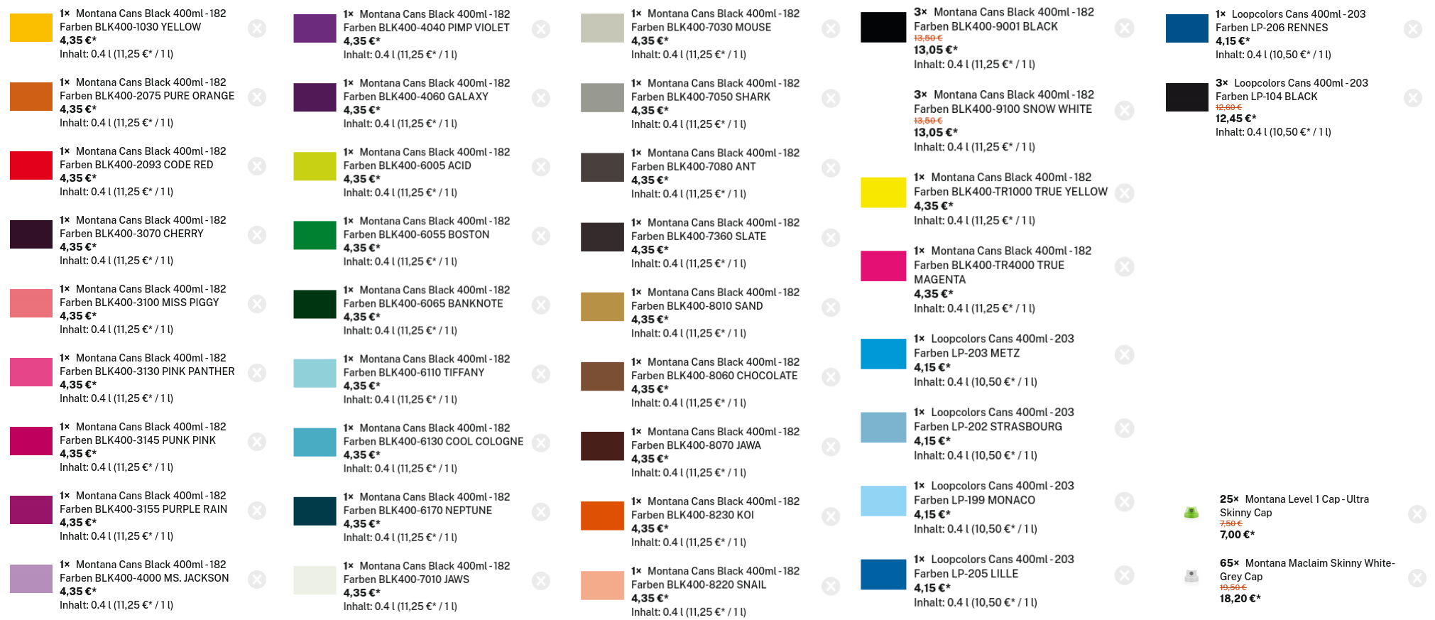 Paint and spraying utensils we bought at betterrun.shop (Leipzig based). When buying paint choose them so that you have different tones of each color: bright, "middle", dark. If you have enough money, add very dark and very bright tones. Additionally, buy much black and little less much (but still much) white. Prefer to choose more expensive colors in favor of quality. We chose for Montana Black and Loop paints following Marco's expertise.