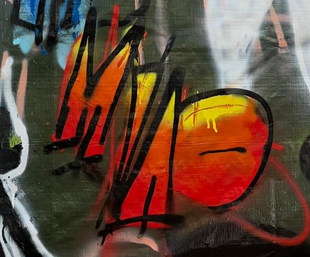 One thing I did was painting a simple sequence of letters. To do that, I first sketched with black, then, I filled everything with a gradient (red - orange - yellow). The border could then be drawn with black spray paint. Additionally, you can scratch away upper layers of color to set accents.